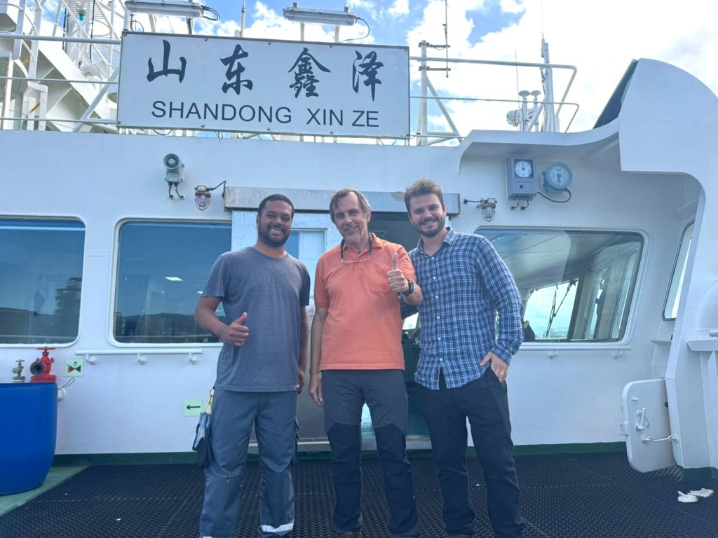 OPERAÇÃO – O navio cargueiro chinês Shandong Xin Ze foi desencalhado do canal do Porto de Santos, a Empresa de salvamento AWS Service foi a responsável pela operação de desencalhe e conduziu o navio até o berço de atracação com segurança e uso da maré em Santos-SP, operação feita com segurança e bem planejada. Após ser descarregado o navio desatracou ontem e seguiu para o fundeadouro e depois segue viagem para a China. No registro, o Especialista de Operações Maritimas Carlos Poignon, Comandante Artur Sequeiros e Engenheiro Naval José Lucas Casagrande.