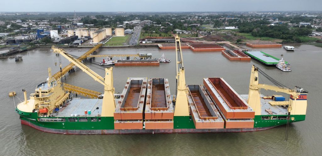 O Terminal de Uso Privado (TUP) da Atem em Belém (PA) sediou uma operação inédita na história da navegação sul-americana: o embarque de 16 barcaças empilhadas transversalmente a bordo do navio de carga pesada AAL Hamburg. A manobra marcou o início do transporte de embarcações destinadas à Hidrovia Paraguai–Paraná, que integrarão a frota fluvial da LHG Logística.
